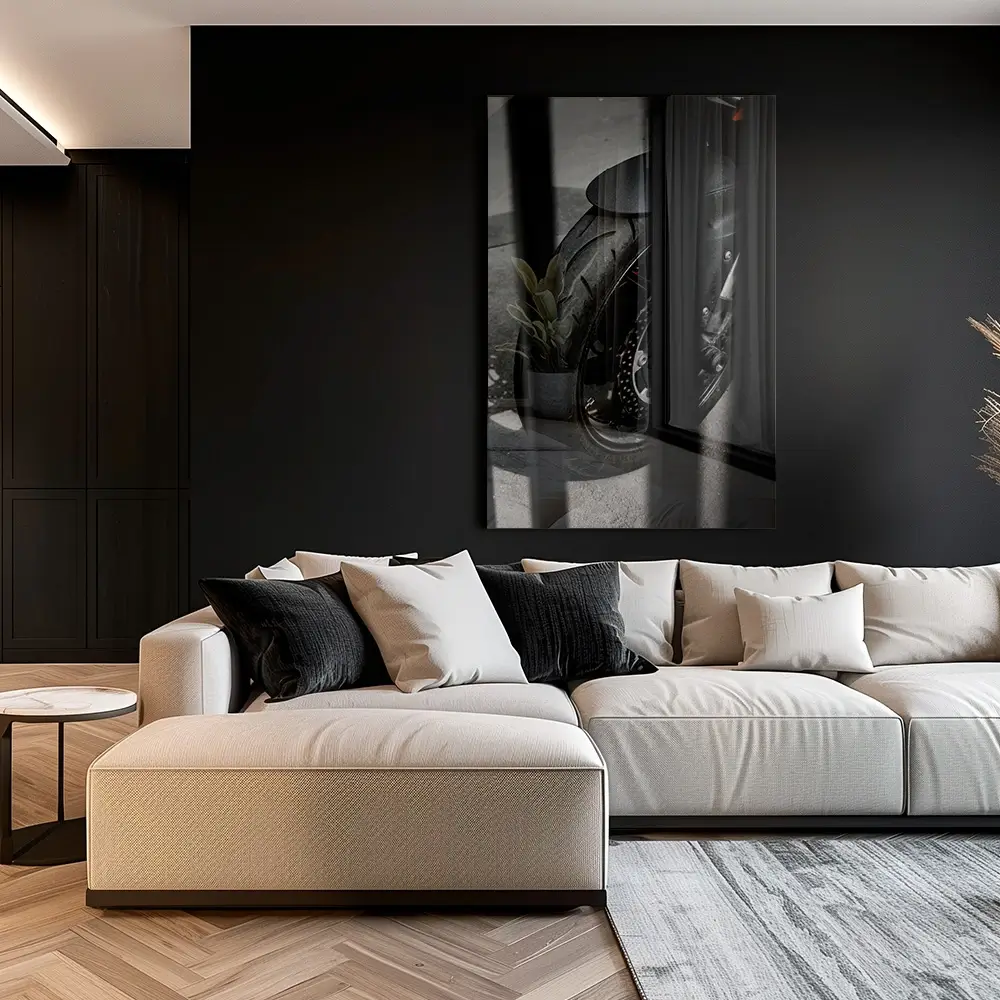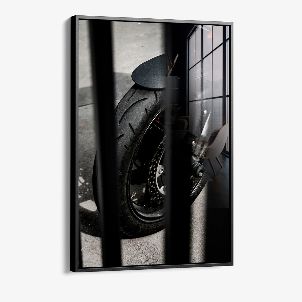 Derrière de fines barres, une roue de moto suggère une vitesse contenue. Dans « Caged Speed », le dialogue caoutchouc–métal–ombre crée un chic industriel. La proximité de la prise confère une énergie nerveuse, élégante et urbaine. Idéale pour un loft ou un espace de travail au caractère affirmé.
