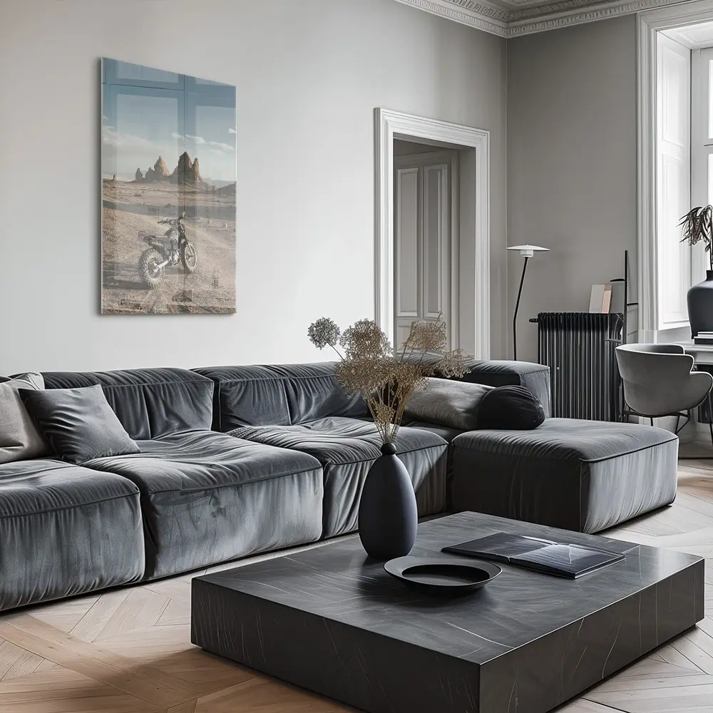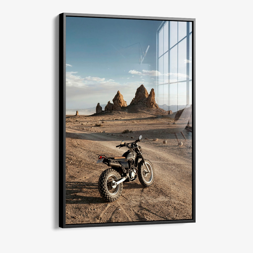 Une plaine ouverte, des pneus crantés et des ombres allongées composent un souffle d’aventure apaisé. Au cœur de « Dust Line Rider », la piste sinueuse guide l’œil vers des aiguilles rocheuses sous un ciel immense. La palette sable, argile et acier affirme une élégance intemporelle. La perspective aérée magnifie un salon contemporain ou un bureau minimaliste. Pièce discrète mais charismatique, elle évoque liberté et maîtrise.