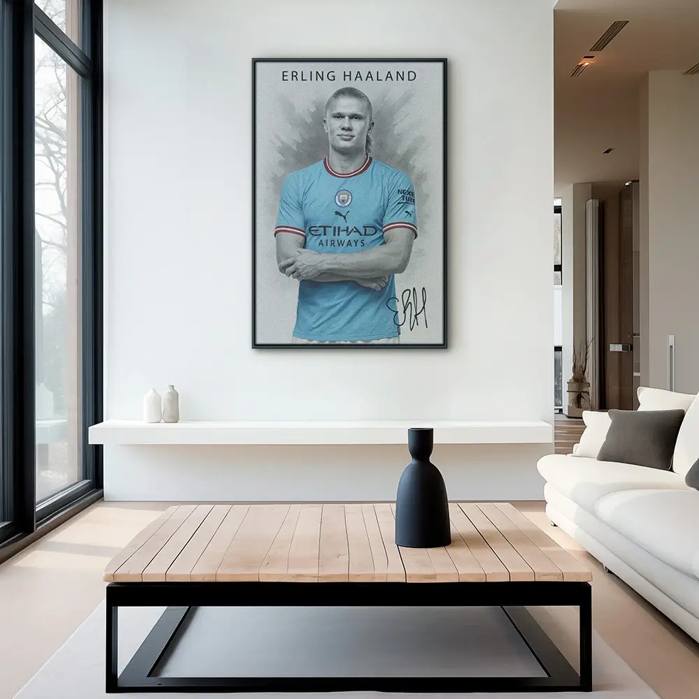 Un portrait de studio épuré, baigné d’un bleu urbain, dégage une force tranquille. Dans « Erling Haaland », l’écusson du club et les mentions Puma, Etihad Airways et Nexen Tire s’invitent avec tact, pour une allure de prestige. Les gris enveloppants affirment une finition haut de gamme. Les lignes nettes magnifient un intérieur contemporain. Une pièce iconique où sport et design s’accordent.