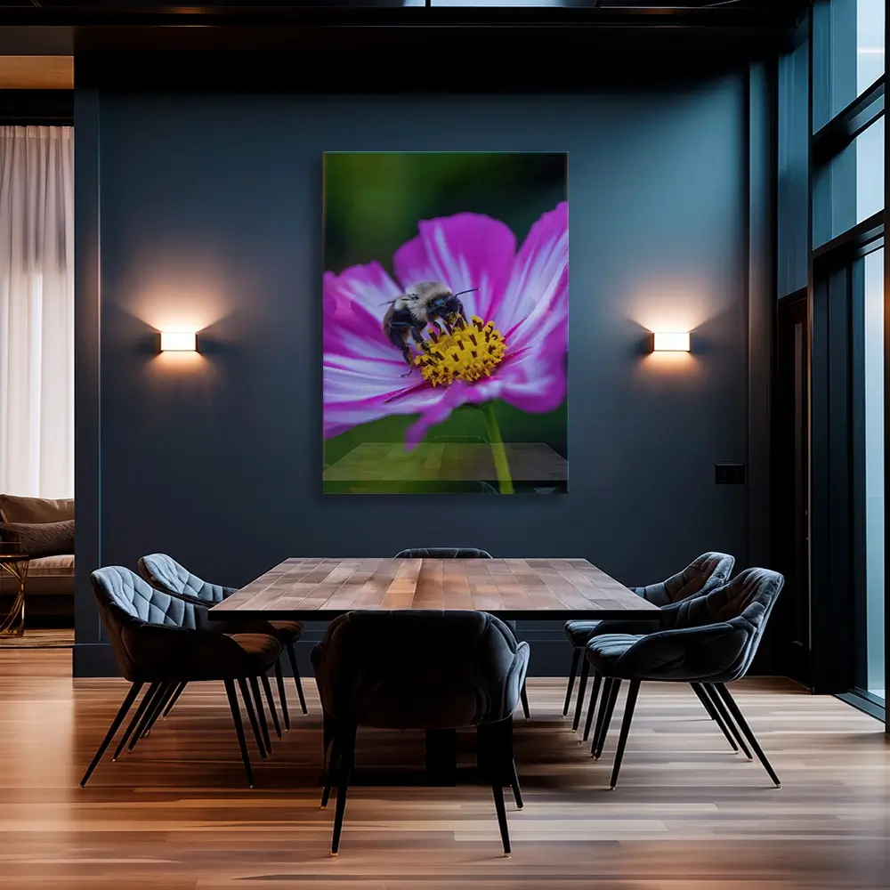 La macro révèle un miroitement de pollen sur des pétales fuchsia et blancs, comme un point d’étincelle. Au sein de « Flarepoint », bokeh velouté et texture précise composent une finition haut de gamme. La palette fraîche dynamise sans s’imposer. Une présence apaisante pour des intérieurs minimalistes et lumineux.