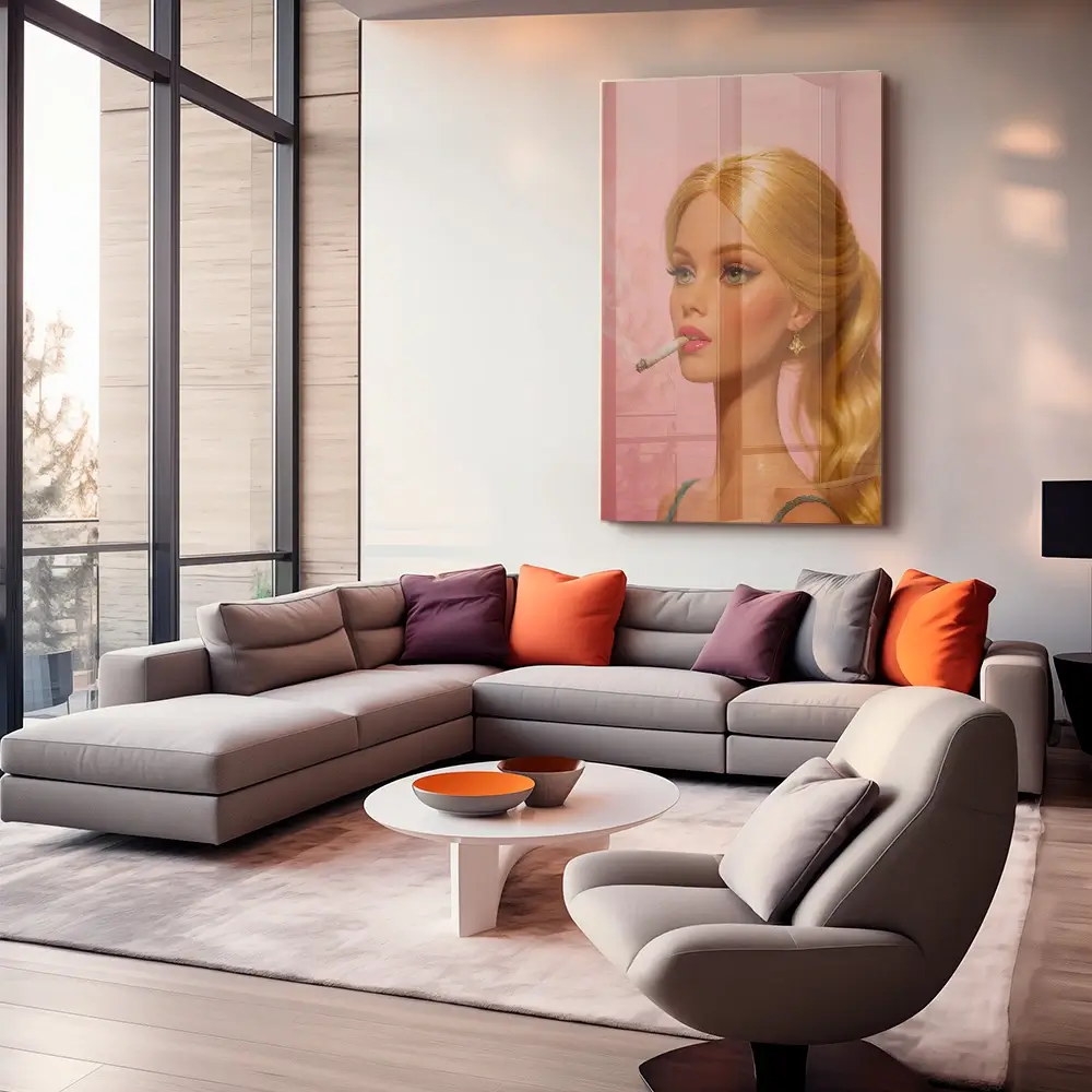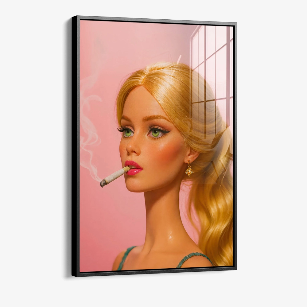 Un portrait serré, eye-liner félin et lèvres glossy, affiche une élégance frondeuse. Dans « Heel Parade III », un détail fumant devient commentaire pop sur le glamour, sans en faire l’éloge. La référence à Barbie reste ludique et ironique. Les nuances peau et l’éclat d’une boucle donnent une finition précieuse. Une pièce audacieuse pour intérieurs au caractère affirmé.