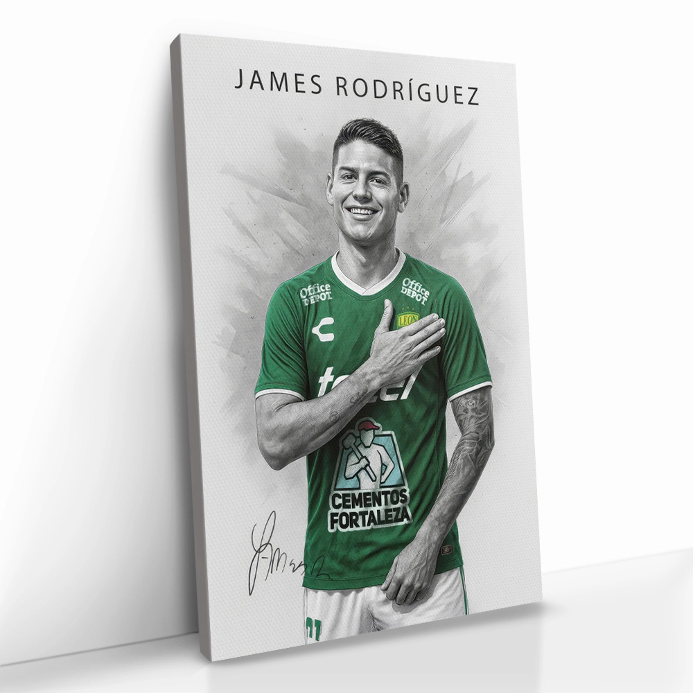 Un vert profond, une main sur le cœur et un grain subtil instaurent une proximité chaleureuse. Au sein de « James Rodríguez », l’écusson de León et les mentions Office Depot, Telcel et Cementos Fortaleza s’invitent avec tact. Les textures du maillot et les ombres feutrées offrent une finition haut de gamme. L’image diffuse un charisme franc, idéal pour des intérieurs contemporains. Un équilibre élégant entre fierté sportive et design.