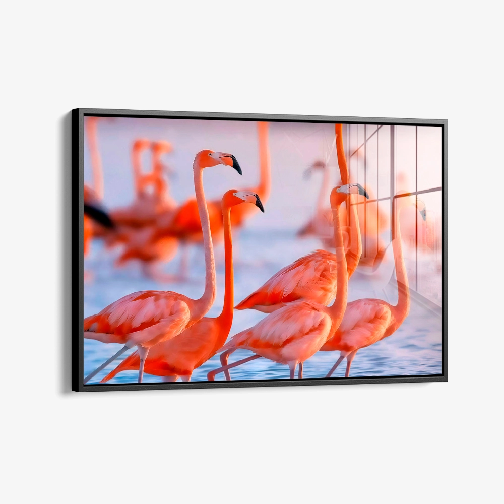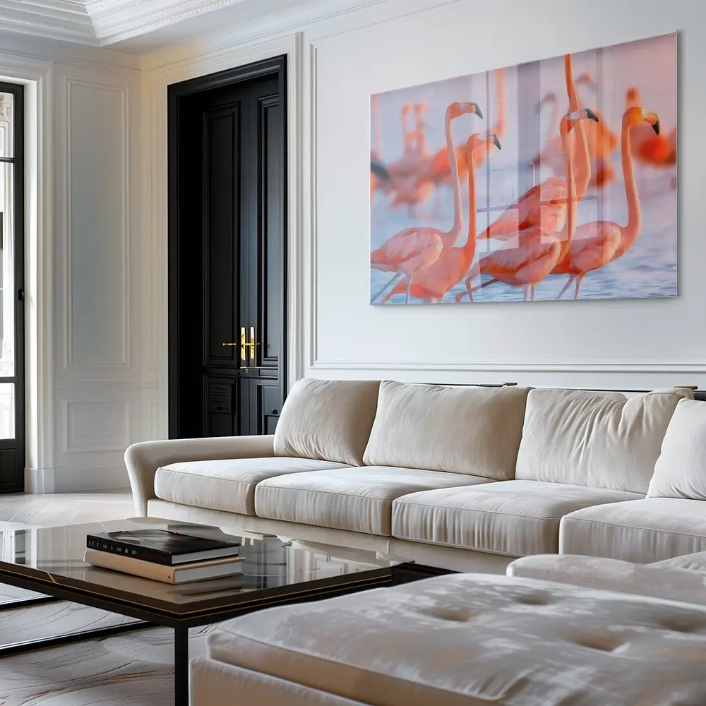 Une lumière tiède rase le lac peu profond tandis qu’un groupe de flamants lève la tête à l’unisson. Le corail des plumages irradie sur les bleus frais, chaque long cou traçant une phrase musicale. À l’arrière-plan, les oiseaux flous deviennent des notes sur une portée pastel. La scène ressemble à une répétition au crépuscule — calme, équilibrée et rythmée.