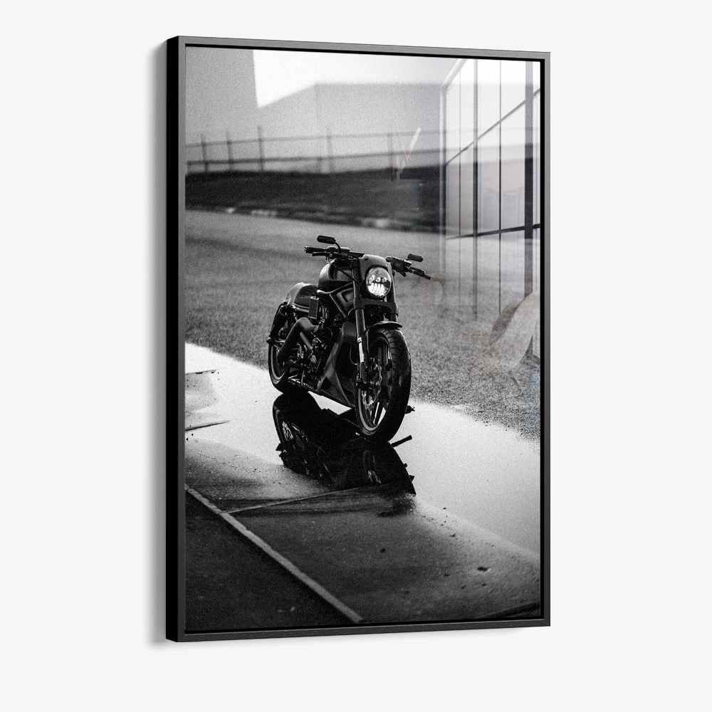 Une moto isolée se reflète dans une flaque, saisie en noir et blanc granuleux. Dans « Lone Rider », le grain cinéma et le miroir au sol sculptent une poésie urbaine. Les contrastes mesurés signent une élégance industrielle. La pièce donne du caractère aux lofts et espaces créatifs. Sobre, affirmée et hautement décorative.