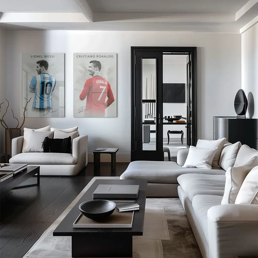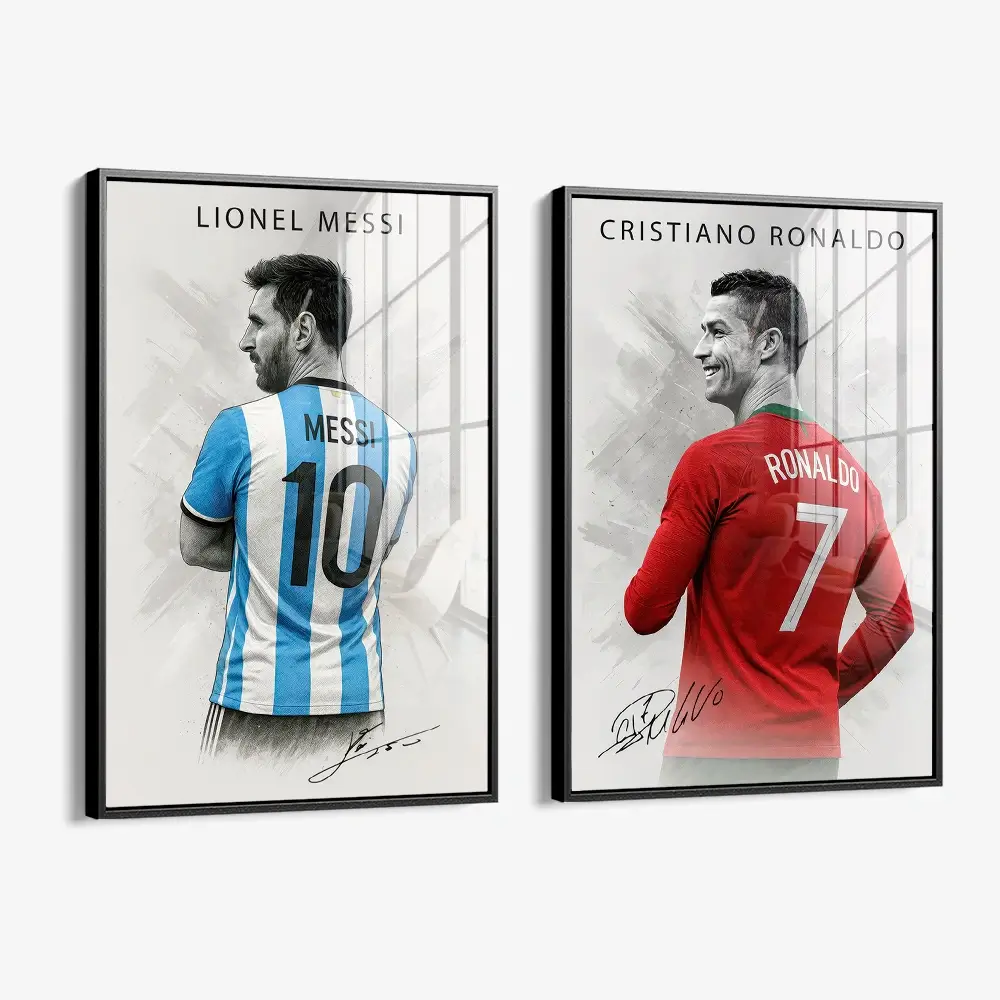Ce diptyque met face à face deux légendes d’époque dans leurs couleurs nationales—bleu-blanc apaisé à gauche, rouge incandescent à droite. Une base graphite et un léger grain offrent une allure intemporelle de galerie. Les numéros iconiques au dos et une typographie nette laissent la rivalité parler sans artifice. Ensemble, le duo compose un dialogue équilibré entre style et héritage.