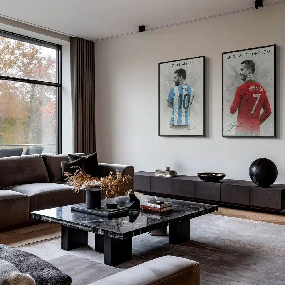 Ce diptyque met face à face deux légendes d’époque dans leurs couleurs nationales—bleu-blanc apaisé à gauche, rouge incandescent à droite. Une base graphite et un léger grain offrent une allure intemporelle de galerie. Les numéros iconiques au dos et une typographie nette laissent la rivalité parler sans artifice. Ensemble, le duo compose un dialogue équilibré entre style et héritage.