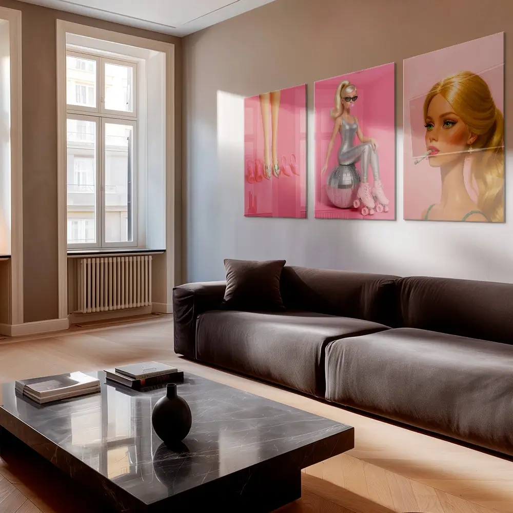 Un triptyque ludique marie l’attitude Barbie à un rose bubble-gum. De la parade de chaussures au look disco, chaque panneau raconte une scène. Une lumière brillante et un léger grain installent une ambiance de diner nocturne. C’est une ode joyeuse à Barbie et à ses tenues infinies.