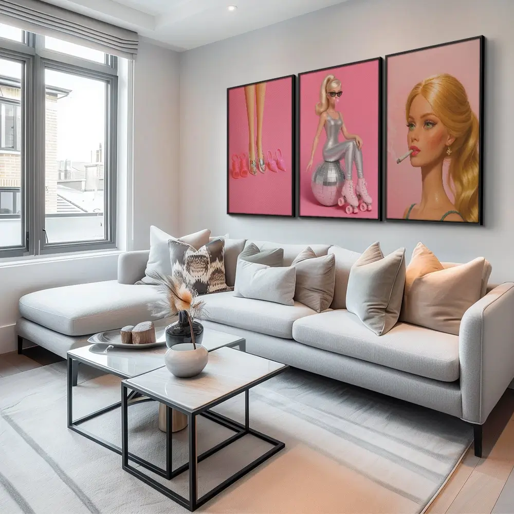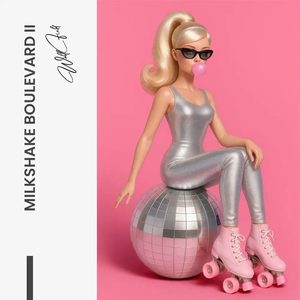 Un triptyque ludique marie l’attitude Barbie à un rose bubble-gum. De la parade de chaussures au look disco, chaque panneau raconte une scène. Une lumière brillante et un léger grain installent une ambiance de diner nocturne. C’est une ode joyeuse à Barbie et à ses tenues infinies.