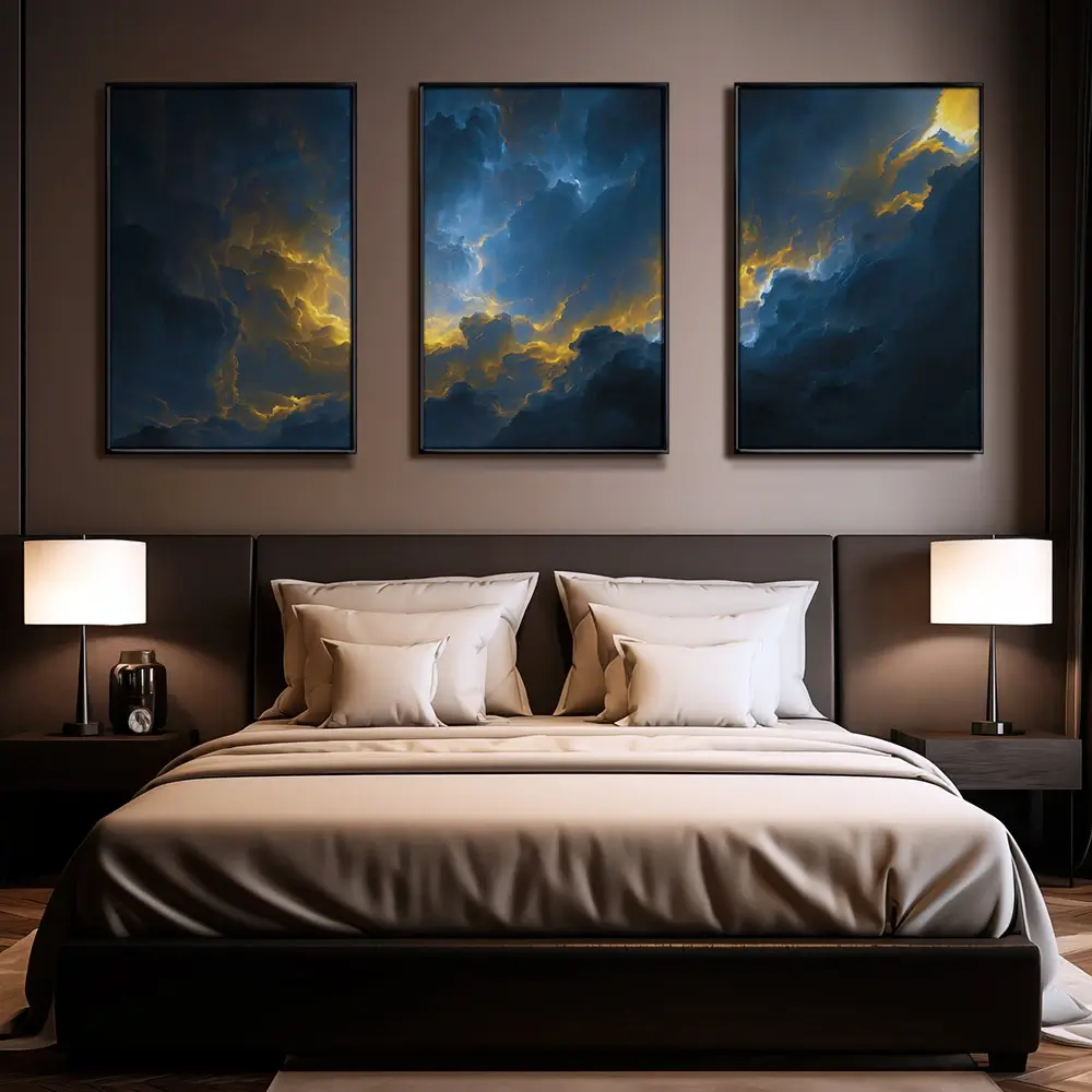 Le « Myth of The Sky (3x) » sublime la beauté du ciel avec un jeu fascinant de bleus profonds et de dorés lumineux. Sa composition triptyque crée un effet panoramique unique, ajoutant grandeur et mystère à l’espace.
