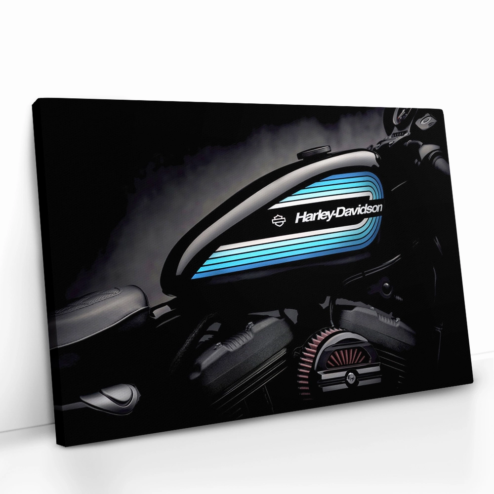 Un réservoir Harley noir devient la toile de bandes progressives bleu électrique. Les lignes se courbent comme une traînée de néon, promettant la vitesse avant même le démarrage. Les pièces chromées se retirent dans l’ombre pour laisser le graphisme mener. Du minimalisme industriel au pouls du night-ride.