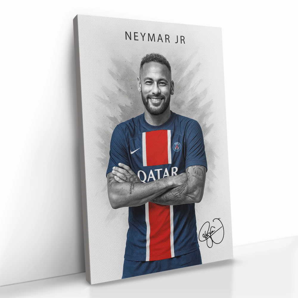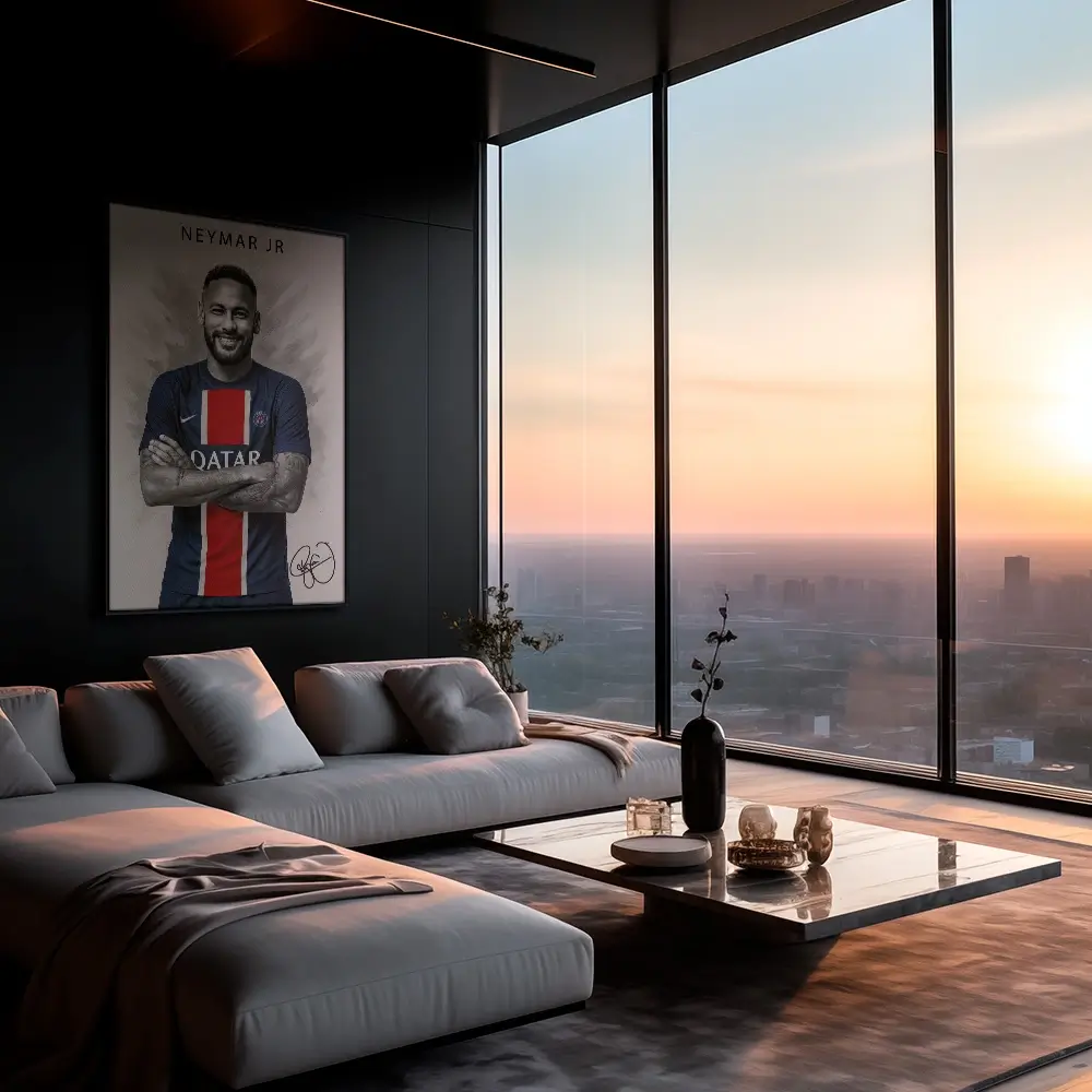 Un sourire posé et un bleu nocturne parisien composent une élégance urbaine. Dans « Neymar Jr », l’écusson du PSG et le swoosh Nike se montrent avec tact, tandis que la mention QATAR insuffle un prestige cosmopolite. Une lumière nette et des contrastes maîtrisés signent une finition de galerie. La verticalité affirme la présence sans lourdeur. Une pièce idéale pour des intérieurs contemporains.