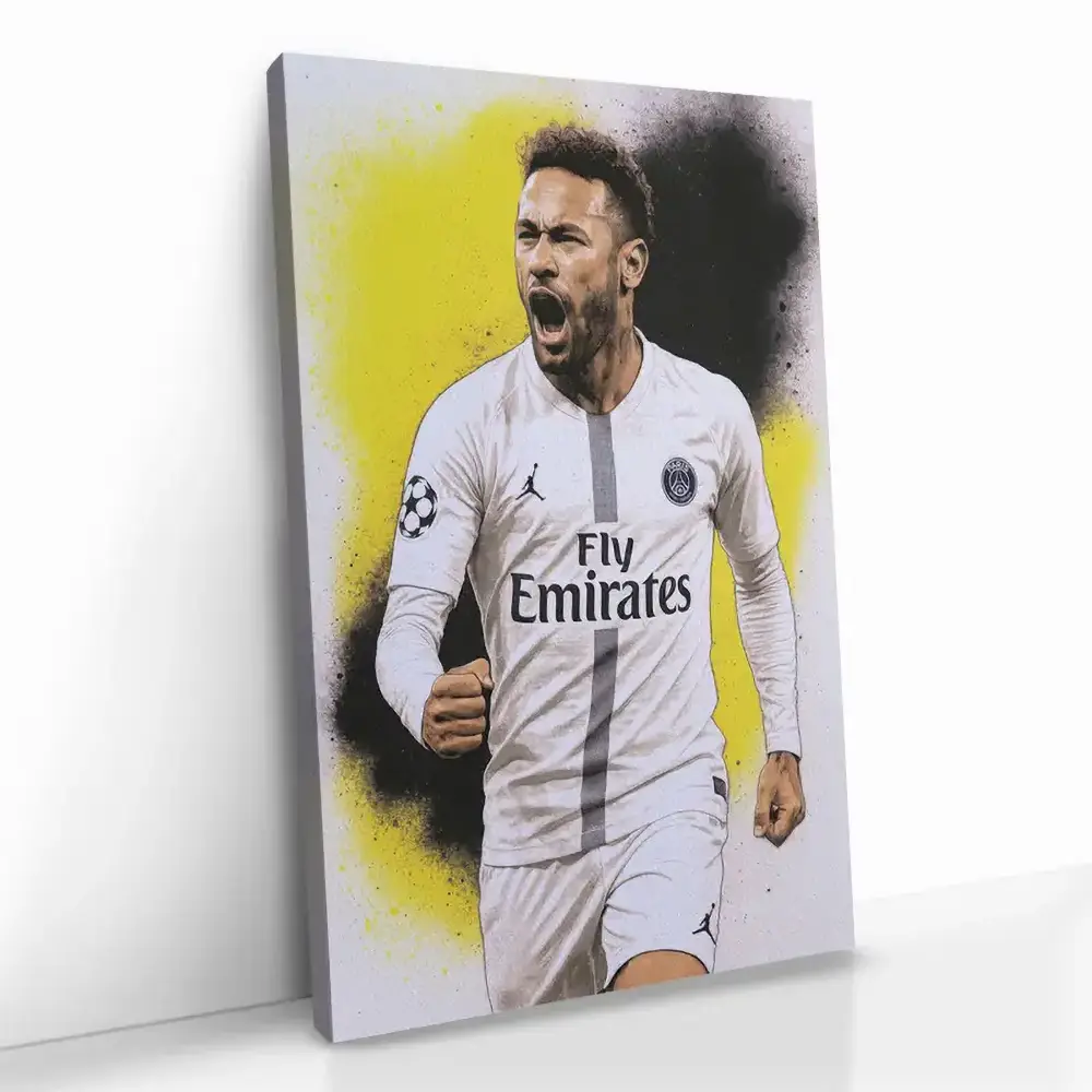 « Neymar Jr » explose d’énergie, capturant un instant de triomphe et d’adrénaline. Le fond jaune amplifie la tension du geste, offrant une composition vive et expressive. Chaque détail témoigne d’intensité, de mouvement et de concentration. Une pièce puissante pour un intérieur audacieux. Un hommage visuel à la gloire sportive.