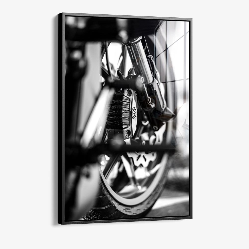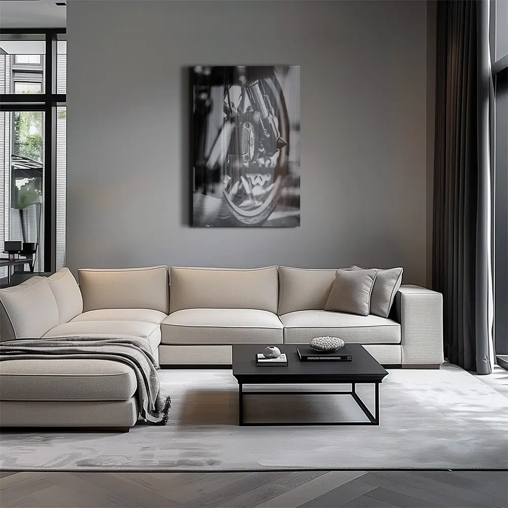 Des lignes métalliques et un bokeh soyeux composent une étude de précision. Par son cadrage tendu, « Precision Spin » devient à la fois technique et élégant. Le noir et blanc concentre le regard sur la matière. Parfait pour des lofts industriels et des bureaux créatifs. Une énergie fine et maîtrisée.