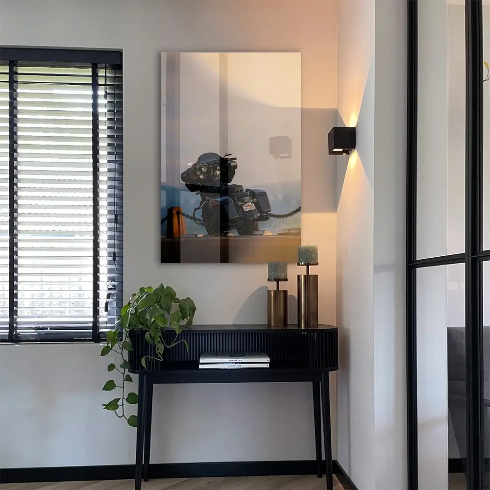 Une cruiser imposante monte la garde au bord de la route, saisie dans une lumière de soir. Avec son volume maîtrisé, « Road Sentinel » impose une autorité feutrée. Les espaces vides généreux donnent souffle et élégance. Une pièce idéale pour lofts et bureaux contemporains.