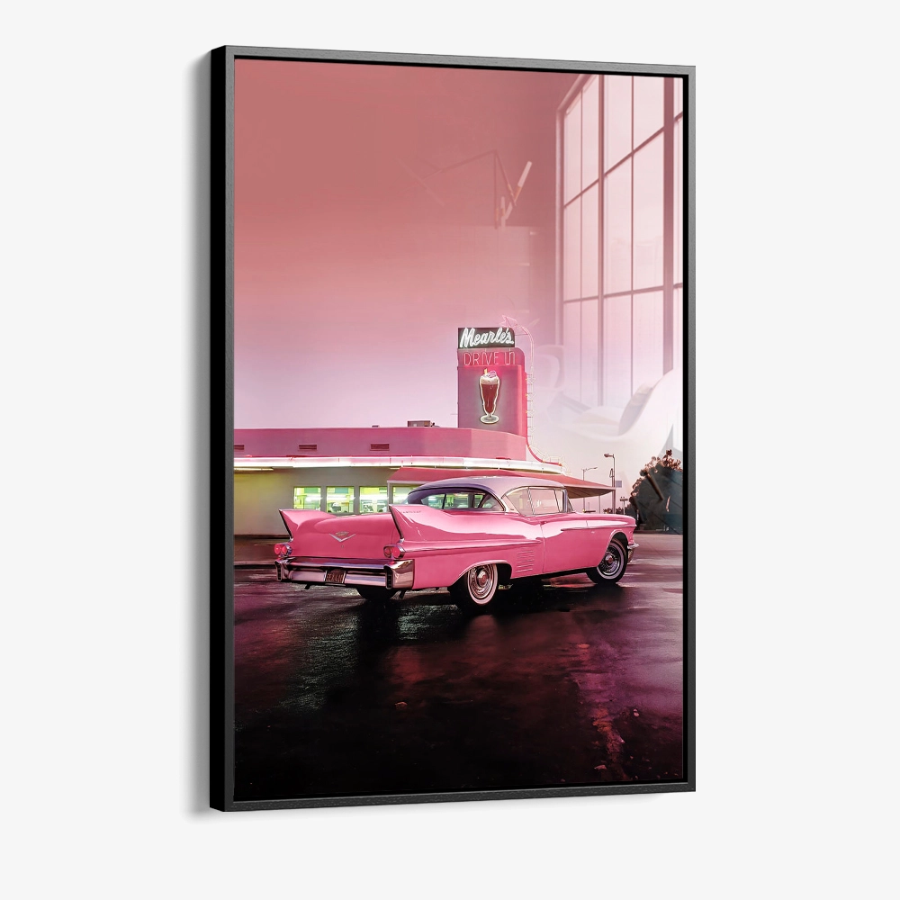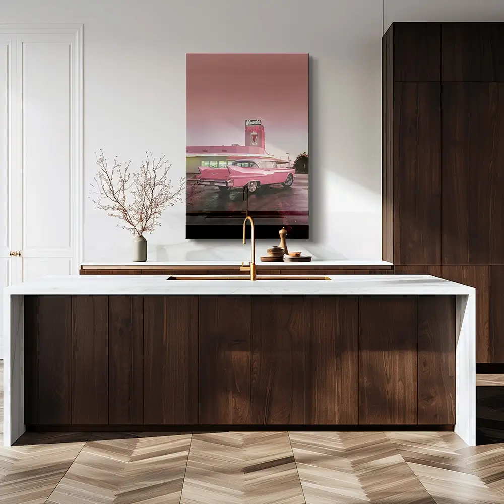 Un ciel rose et des ailerons brillants réveillent l’imaginaire du diner américain. Par ses reflets et son enseigne Mearle’s, « Roadside Vintage » distille une nostalgie chic et collectionnable. Les lignes de Cadillac apportent une sophistication assumée. Les grands aplats donnent souffle et lumière aux pièces contemporaines. Une note rétro qui reste résolument premium.
