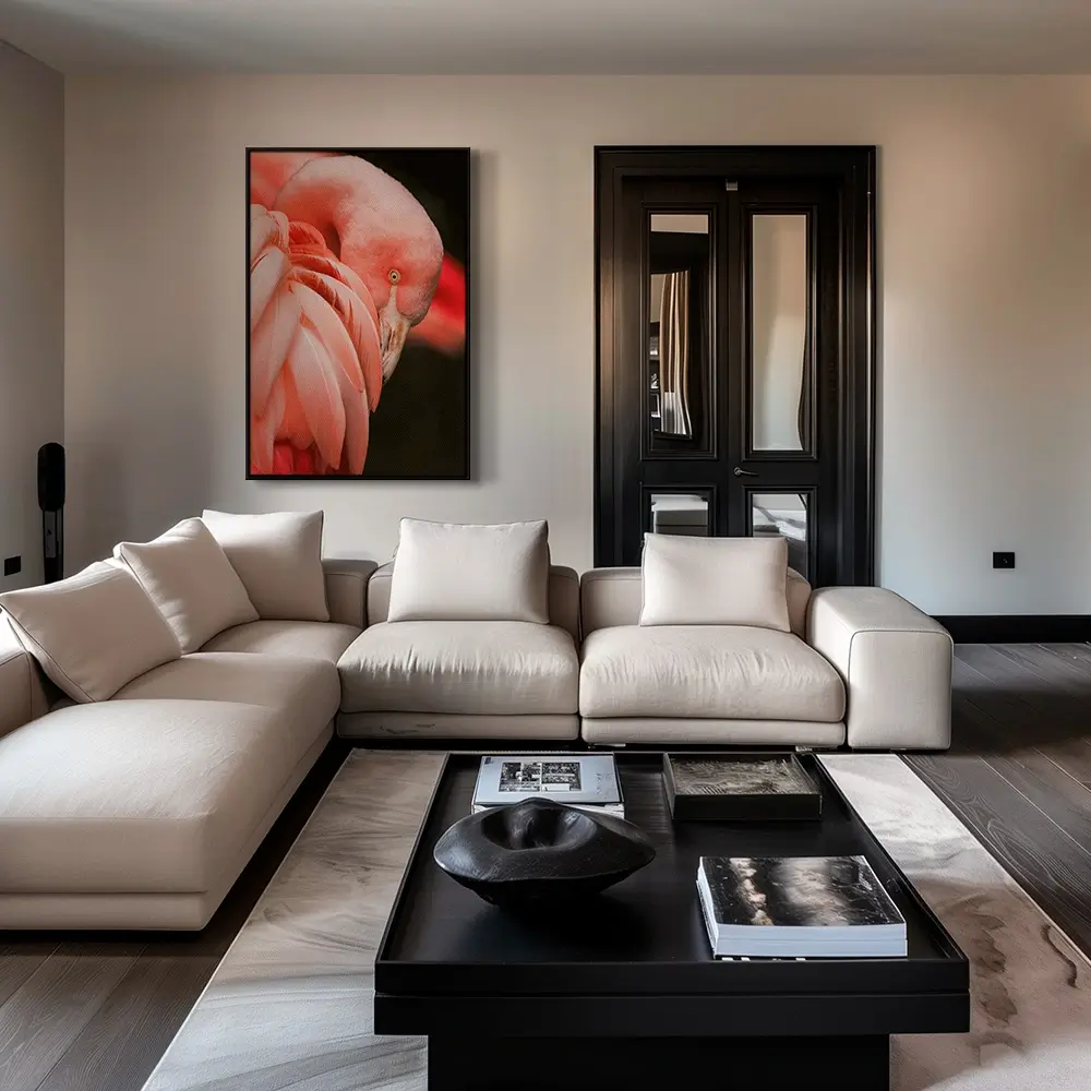 Des tons corail et pêche, des plumes satinées : « Side Veil » déploie une douceur luxueuse. Le cadrage serré lui confère une élégance presque sculpturale. Le fond sombre magnifie la lumière et la couleur. Une pièce apaisante pour salons et suites contemporaines.