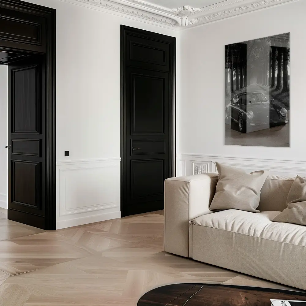 Porsche classique dans une allée qui se ferme en tunnel d’arbres. Le noir et blanc souligne la forme et l’intemporalité. Un voyage silencieux en une image.