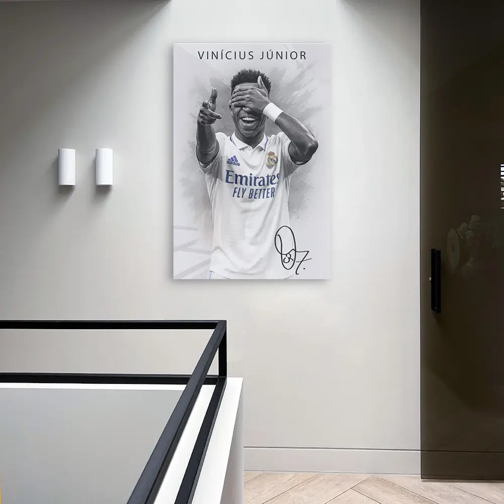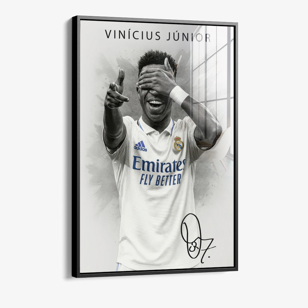 Vini célèbre avec malice : une main sur les yeux, l’autre pointée vers le spectateur. Son rire déborde et brise la pose. Les gris dessinés soulignent le blanc du maillot et ses accents bleus. Le portrait capture une joie pure, une touche d’espièglerie et l’aisance d’une star.