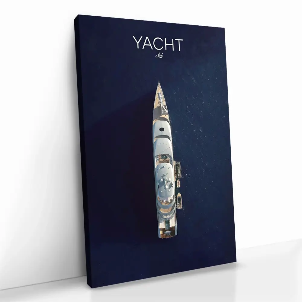 Le « Yacht Club II » dévoile une vue aérienne d’un yacht imposant, flottant sur un bleu profond. La composition minimaliste met en avant le prestige et la sérénité. Idéal pour un intérieur qui respire la sophistication et l’aventure.